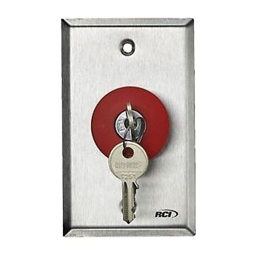 Emergency release keyswitch and maintained action pushbutton with a 32D red cap finish.