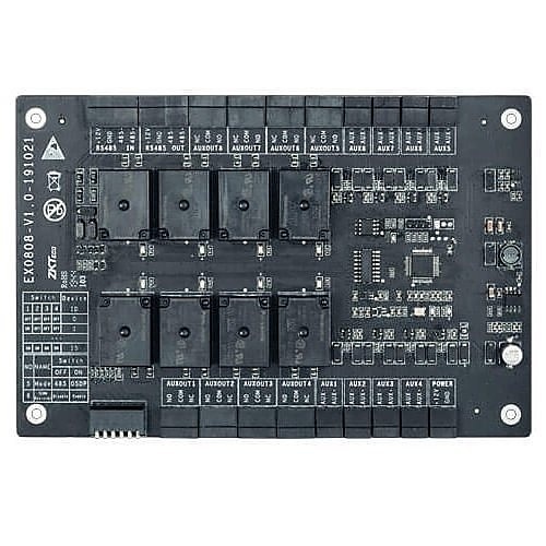 The EX0808 module features 8 auxiliary inputs and 8 auxiliary outputs, optimizing project costs for enhanced input/output requirements. This versatile device provides a comprehensive access control solution by seamlessly integrating with inBio Pro panels, C3 Pro panels, and the robust ZKBioSecurity software—a powerful all-in-one access control platform. The EX0808 supports OSDP communication, allowing smooth integration with other OSDP-compatible panels. Each inBio Pro and C3 Pro panel can accommodate up to 8 EX0808 boards, enabling up to 64 auxiliary inputs and 64 auxiliary outputs. An optional metal case is available for straightforward installation.