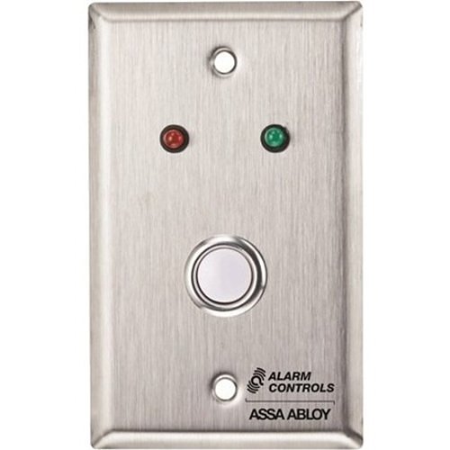 Remote control wall plate featuring a white push button and red and green LED status indicators for streamlined access control.