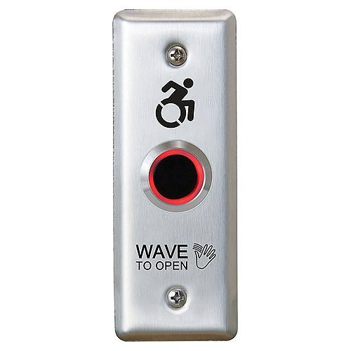 The Camden ValueWave™ touchless switches, operating on 12/24 VDC with a single relay, boast an IP65 rating, making them suitable for both indoor and outdoor environments. These touch-free switches are perfect for integration into automatic door systems and access control solutions, ensuring straightforward installation and reliable performance in high-traffic areas. They are offered in various models with options for narrow, single, and double gang stainless steel faceplates, along with a variety of faceplate graphics for customization. The ValueWave™ hands-free switches featuring narrow (jamb width) faceplates are water-resistant and include a standard built-in light ring, enhancing their functionality for access control systems.