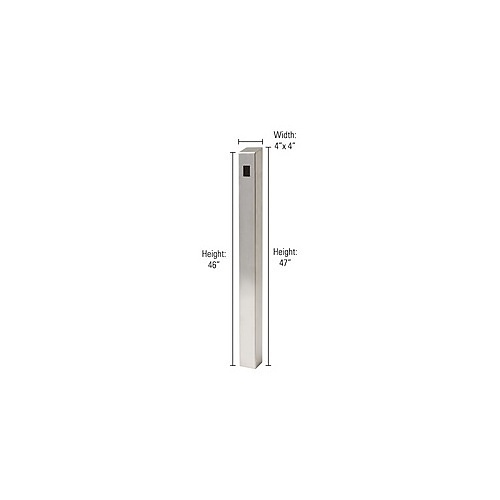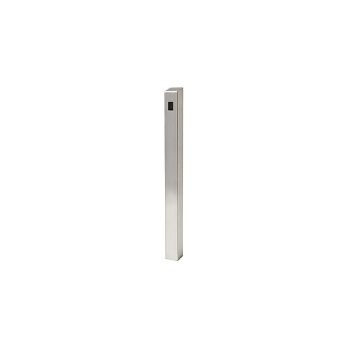 A striking brushed stainless steel bollard designed for decorative entryways, glass lobbies, high-end commercial spaces, and premium client environments. Engineered for mounting various access control devices such as card readers, door stations, surveillance cameras, intercoms, keypads, entry/exit buttons, and biometric readers, this pedestal is predominantly utilized for its aesthetic appeal in upscale installations. The bollard features rounded corners polished to a mirror finish and flat surfaces polished with a 180 grit #4 finish, with a top tapered for architectural elegance. It includes a single gang cutout with two mounting holes, and additional cutouts are available for a nominal fee.