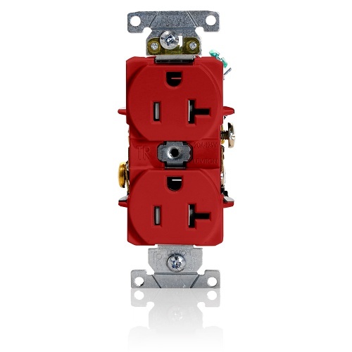 Industrial-Grade Tamper-Resistant Duplex Electrical Outlet, 20 Amp, 125 Volt, with Smooth Face, Back or Side Wiring Options, NEMA 5-20R, 2-Pole, 3-Wire, Self-Grounding, in Red, Suitable for Heavy-Duty Electrical Applications.