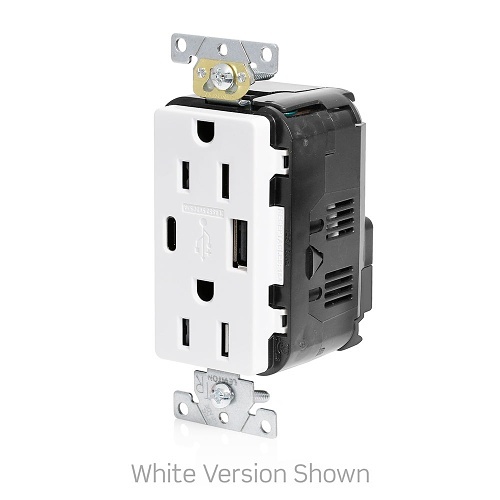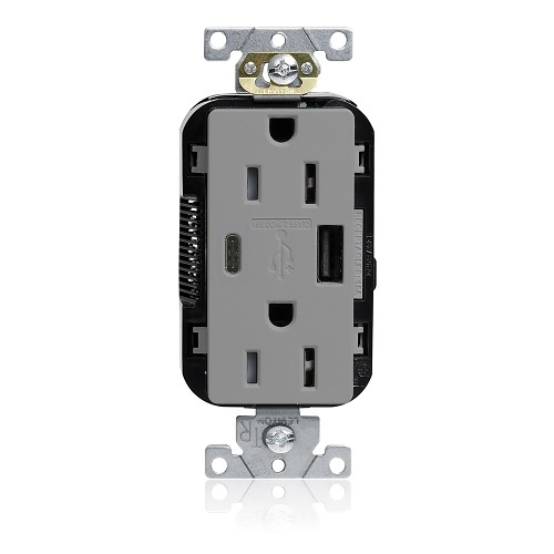 Lev-Lok Tamper-Resistant Duplex Decora Receptacle with Dual-Port USB Type A-C Charger offers an efficient and secure solution for electrical installations. This device features a NEMA 5-15R, 15A-125V configuration with a 2 Pole, 3-Wire Grounding Receptacle in a sleek gray finish. The Lev-Lok design incorporates a twist and lock wiring mechanism, ensuring a safe connection that enables installations to be completed up to three times faster and swap-outs to be performed up to five times quicker compared to traditional methods, leading to significant savings in time, labor, and costs.