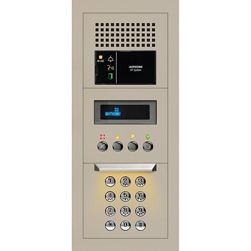 The GTA-DESB serves as a versatile audio entrance station in the GT Series multi-tenant video intercom ecosystem, offering modular functionality to optimize building communication systems. This sophisticated entry panel features an advanced audio module for seamless communication, an intuitive keypad for direct tenant dialing, and a dynamic display module that conveys greeting messages, tenant directories, and real-time system status updates. With multilingual support, the integrated user guide on the audio module can be customized to display operational instructions in one of six languages, enhancing user experience by illuminating relevant icons and providing optional audible guidance. The entrance station utilizes a common bus wiring architecture, efficiently managing call and communication functions through a 2-conductor wire. Power for the tenant directory module comes from an independent power supply, whereas the audio module is powered via the common bus wires. Engineered for semi-flush mounting, the station also offers additional weather protection through an optional rain hood and surface mount box, the latter of which is recommended for installations requiring surface mounting.