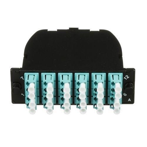 OM3 24-fiber capacity, standard insertion loss, LC duplex adapter cassette (color and split sleeve depend on fiber type), Standard Method A configuration.