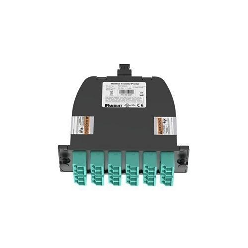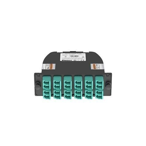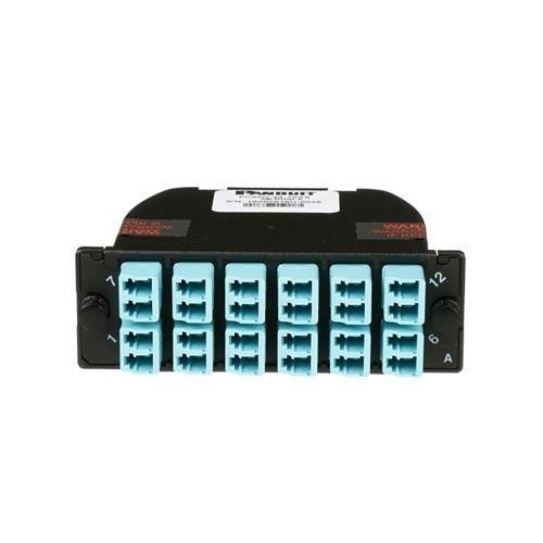 The OptiComĀ® Fiber Cassette is designed for high-performance OM4 multimode fiber applications, featuring a configuration of 2 MPO connectors to 12 duplex LC adapters, effectively managing a total of 24 fibers. Engineered with optimized insertion loss and universal polarity for seamless integration, this cassette sports a sleek black housing and includes 2 black MPO connectors alongside 12 aqua LC adapters, ensuring efficient and reliable fiber optic connectivity.
