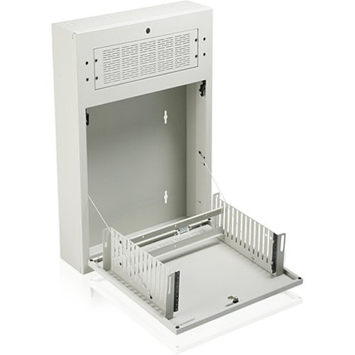 Experience enhanced accessibility and security with the newly redesigned 2RU tilt-out wall cabinets for 19″ equipment by Atlas-Sound. These versatile welded enclosures can be either surface or recessed mounted, complete with a trim ring, and include a 3RU panel opening above the main compartment for connector panels or power distribution. The AWR2W model offers a usable depth of 4″, while the AWR3W provides 5.75″, making them ideal for housing remote amplifiers and control equipment. The series is crafted with a robust 16-gauge cold rolled steel (CRS) door frame and a locking tilt-out door, which securely closes against the rack faceplate. Designed to prevent tampering, the door is internally attached with two pin-style hinges. It can be opened in two positions—tilt-out for operation or at a 90° angle for equipment installation and maintenance by releasing side catches. The units include two steel safety catch cables that support the door at 90°. The front panels feature 45-degree mitered edges for a sleek, flush look, and the back box, made of 16-gauge CRS, is equipped with six concentric knockouts of 1/2″ and 3/4″. The series is shipped fully assembled and ready for installation, with panel mounting holes that accommodate 10-32 hardware. The top RU provides a usable depth of 20″ (50.8cm), while the bottom RU offers 17.25″ (43.81cm).