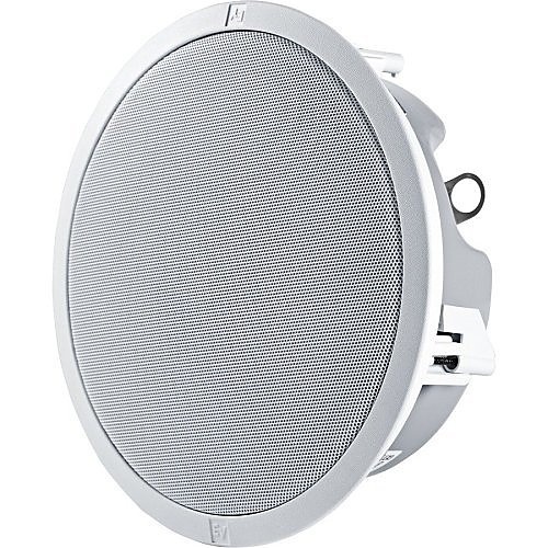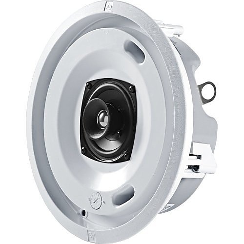 The Electro-Voice EVID-C4.2LP is an ultra-compact two-way ceiling speaker system designed for versatile audio applications. This system features a bezel assembly, grille, rear enclosure, and a 4-inch coaxial two-way speaker paired with an internal line-matching transformer. Equipped with a waveguide-coupled titanium coated dome tweeter, the speaker system incorporates a 2nd order crossover network set at 2.5 kHz. This design includes an advanced protection circuit to safeguard the network, woofer, and tweeter from excessive power levels. The EVID-C4.2LP is engineered with a transformer providing wattage options of 1.88 (70-V only), 3.75, 7.5, or 15 watts via 70-V or 100-V lines, as well as an 8-ohm bypass option. Selection is conveniently made using a switch on the front baffle. The speaker showcases a perforated grille with a semi-gloss white powder-coated enamel finish. Constructed from UL 94V-0 rated ABS, the baffle and bezel ensure durability, while the rear enclosure boasts zinc-plated, heavy-gauge steel construction. Its low-profile design facilitates installation in tight spaces, with easy access to a 4-pin terminal block for 12-gauge wire connections and pass-through to additional speakers. A tile bridge is included to safely suspend the EVID-C4.2LP within drop ceilings composed of mineral wool or other fiber-based tiles. Designed as a part of the EVID ceiling speaker line, these speakers deliver broad dispersion, high efficiency, and high-maximum output, ensuring seamless installation and superior reproduction of music and voice across varied ceiling constructions.