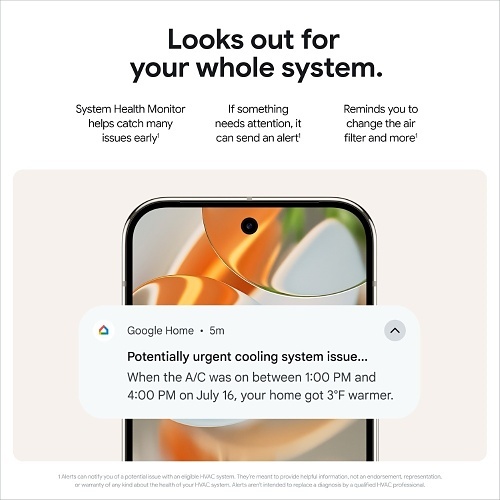 The expansive, borderless display featuring Dynamic Farsight presents valuable information visible from across the room. Customize the interface to showcase designs, time, temperature, weather, and more. The System Health Monitor ensures your HVAC system operates efficiently, detecting potential issues early and providing alerts when maintenance is needed. Intelligent ventilation introduces fresh air when outdoor conditions are optimal, contributing to energy conservation at home. Additionally, Nest Renew’s Energy Shift feature can automatically adjust your energy usage to take advantage of cleaner or more cost-effective times.