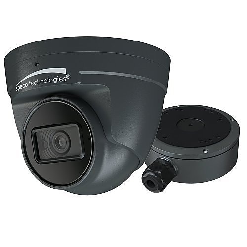 Monitor indoor or outdoor spaces with the dark gray Flexible Intensifier O8FT1 8MP Network Turret Camera from Speco Technologies. This camera is equipped with a 1/1.8″ progressive scan CMOS sensor to capture 4K UHD resolution video at 30 frames per second. Featuring infrared LEDs, it offers night vision capabilities up to 98 feet. The 2.8mm fixed lens provides a wide 110° horizontal field of view, and the device includes a built-in microphone along with a 3.5mm audio input. With integrated Power over Ethernet (PoE) technology, the camera facilitates streamlined connectivity by transmitting power and data via a single cable. Additionally, it has a memory card slot that supports microSD cards up to 256GB (sold separately).
