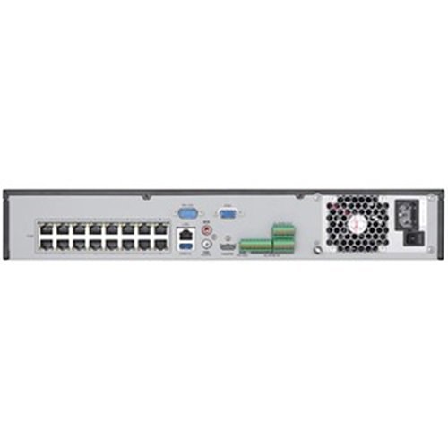 This NVR supports live view, recording, and storage functionalities for up to 16 cameras simultaneously, offering resolutions up to 12 MP. It facilitates centralized camera management and includes features such as data import/export, real-time information display, two-way audio, and intelligent video content analysis (VCA) detection alarms, enhancing overall operational efficiency and responsiveness.