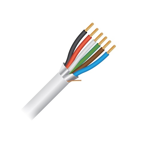 This cable features six conductors made from 22 AWG stranded bare copper, encased in color-coded low smoke PVC insulation. It is equipped with an overall aluminum polyester shield and a drain wire, all encased in an overall low smoke PVC jacket in white.